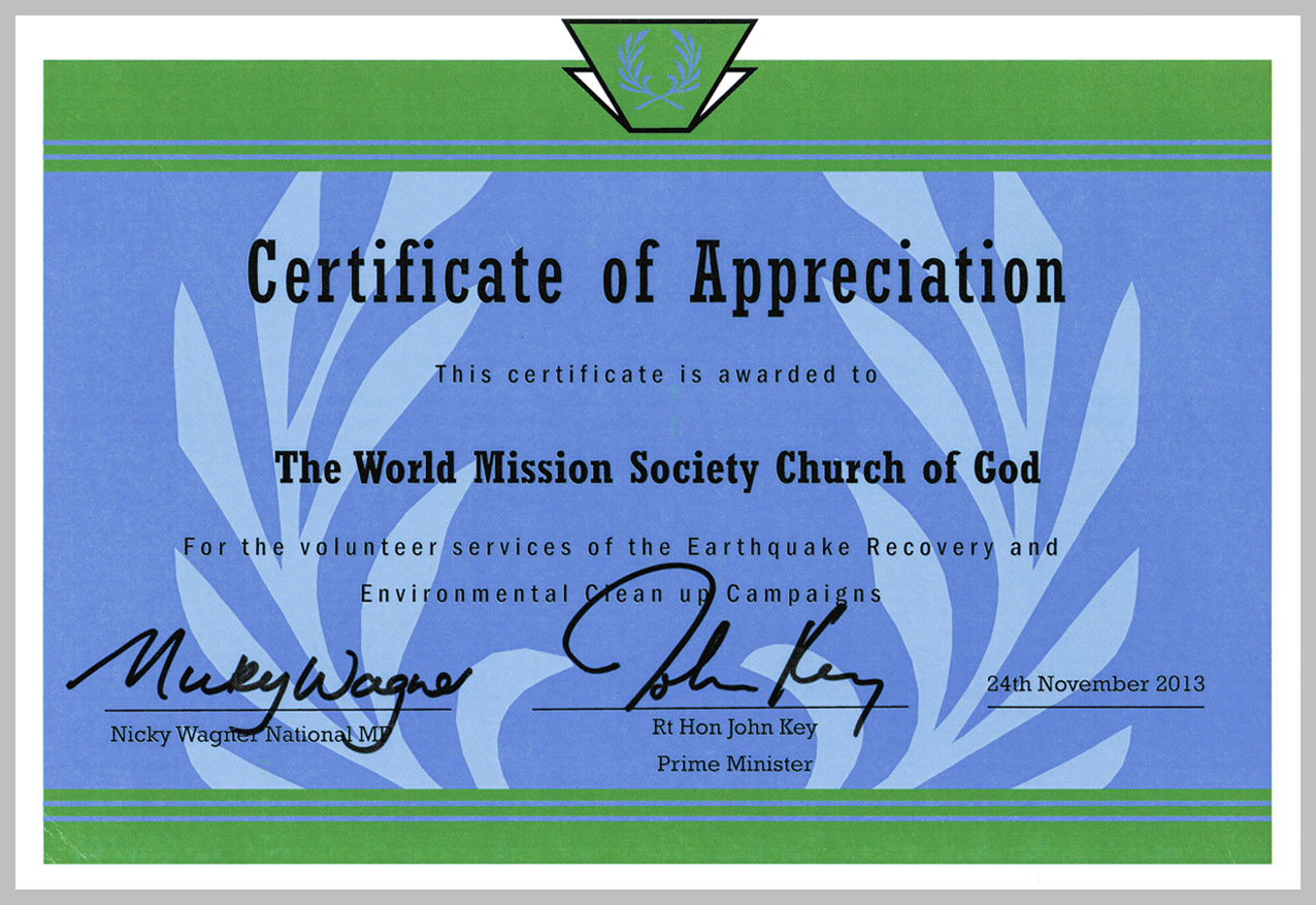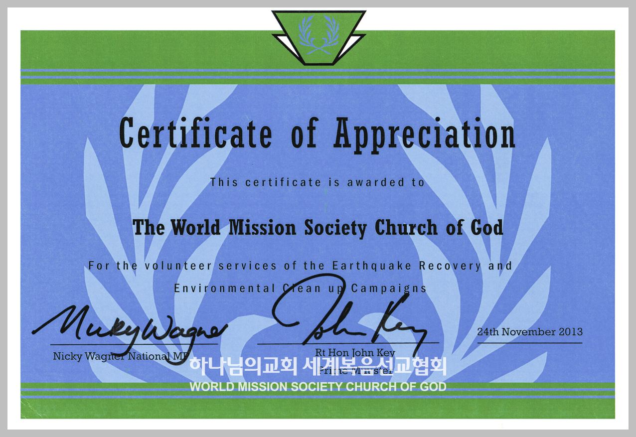 뉴질랜드-수상-감사장_하나님의 교회